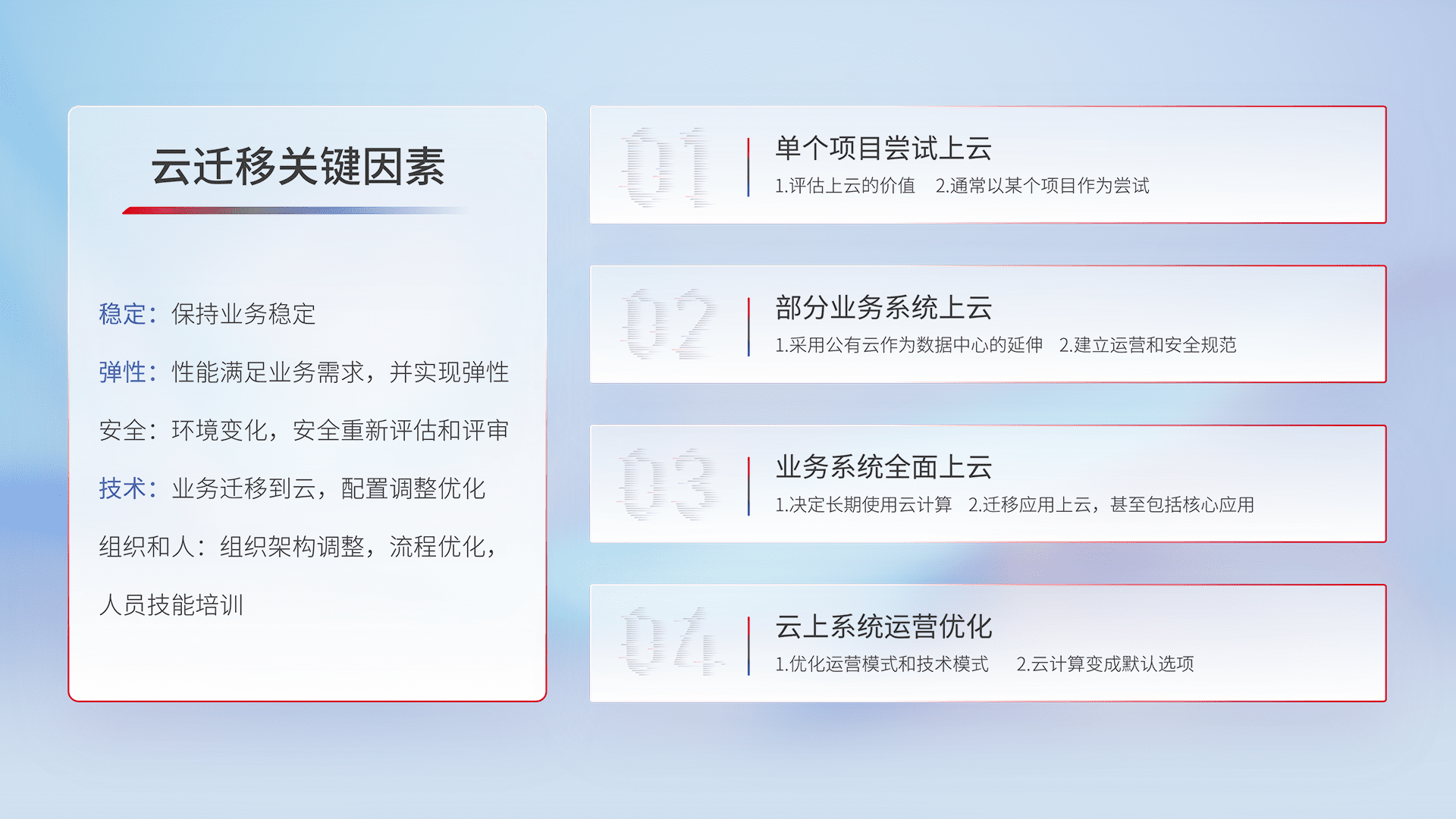 结合实际业务,,从规划设计、、、云平台选型、、、、云原生改造、、、数据迁移、、、、集成交付,,迁移全过程为客户识别最佳上云路径,,做好风险识别管理,,设计网络架构、、、身份权限、、安全审计合规、、、、操作审计、、、日志审计、、监控告警策略、、、、多站点容灾设计等,,,,对云上基础设施进行整体规划,,提升IT治理水平,,,,以满足弹性、、高可用、、高性能的需求。。