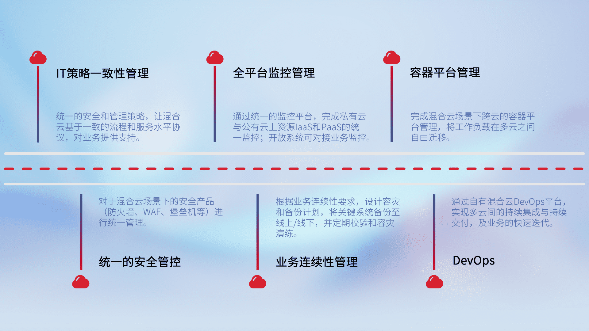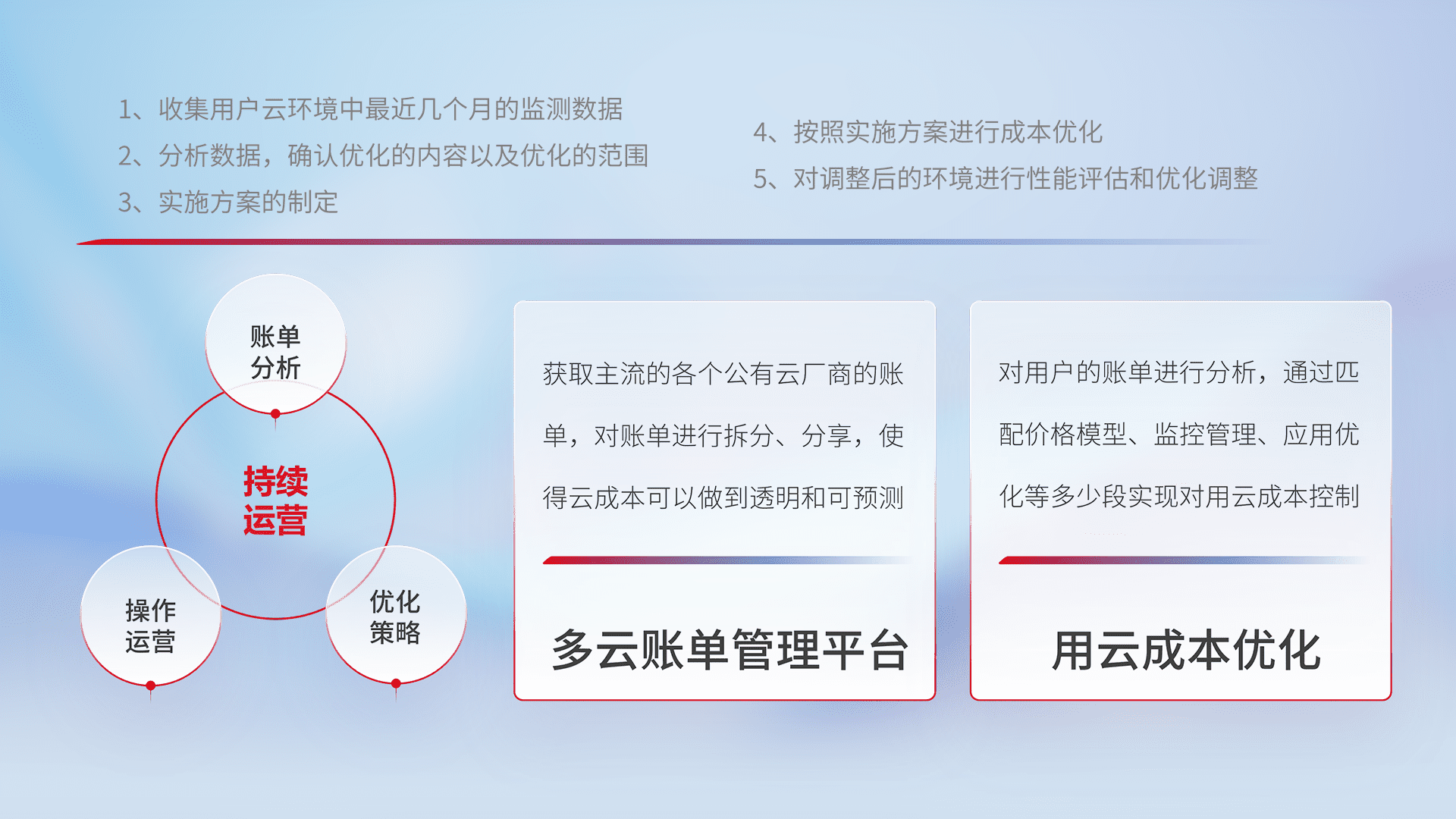 通过多云纳管,,,,以统一的资源数据模型把客户的云资源进行抽象和封装,,,进而实现对多云资源的统一操作,,保障云资源管理的可靠性、、稳定性与可用性。。量身定制化运维内容,,,,配置、、开发运维、、、、补丁管理、、备份、、、、监控、、、、认证和访问管理、、、、审计和日常巡检等,,保障在用云过程中的可靠度,,,稳定度以及高可用率。。