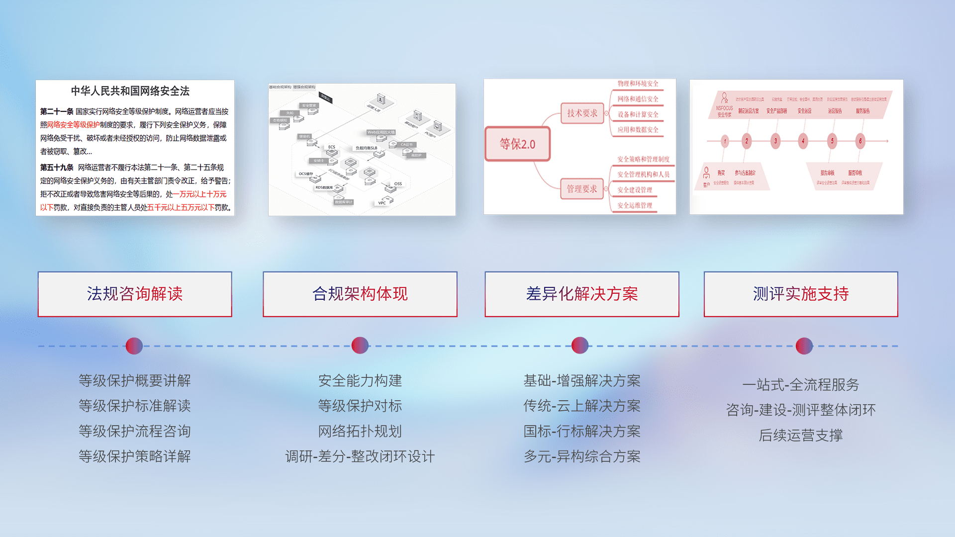 通过专业的法律咨询解读、、、合规架构体现、、、差异化解决方案、、、测试实施支持等服务,,,,为客户量身打造等保合规体系。。。。